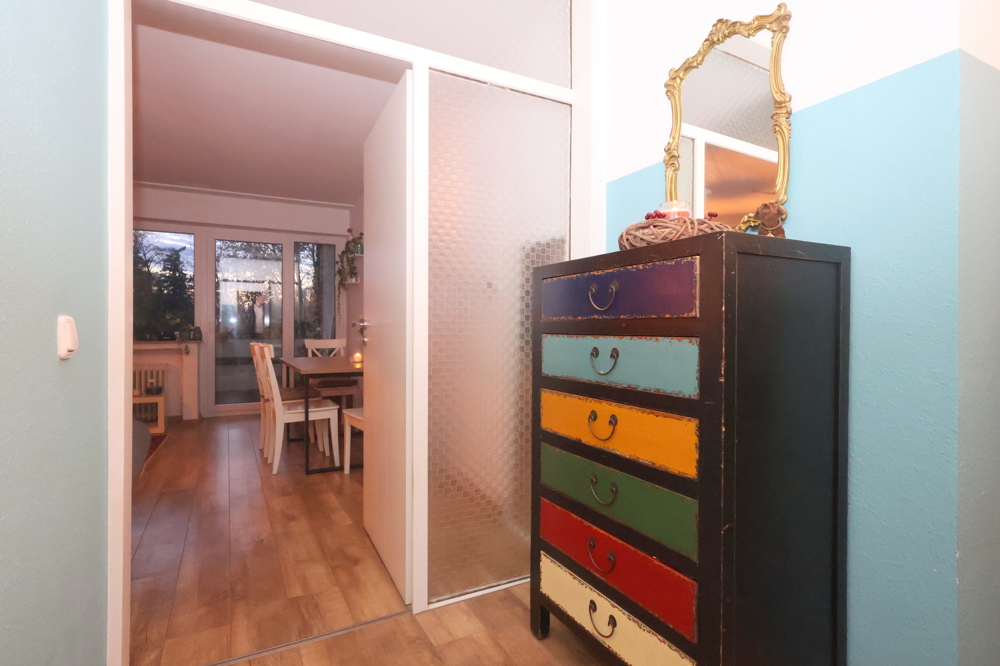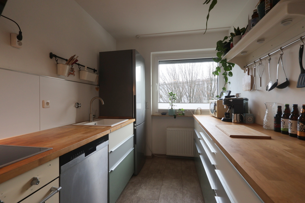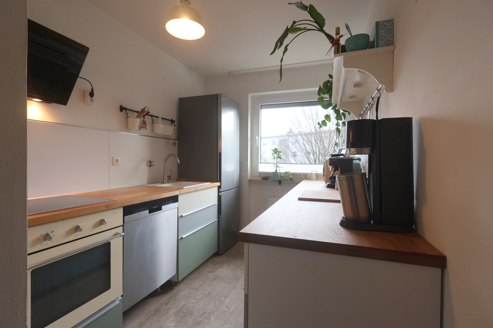 Beim Betreten der Wohnung gelangen Sie in einen geräumigen Flur, der Zugang zu allen Räumen verschafft. Das helle Wohnzimmer ist der zentrale Punkt der Wohnung und führt direkt auf den Balkon, der zum Entspannen einlädt. Die voll eingerichtete Küche ist ansprechend gestaltet und bietet Platz für kulinarische Kreationen. Hier hängt auch die moderne Gasetagenheizung.