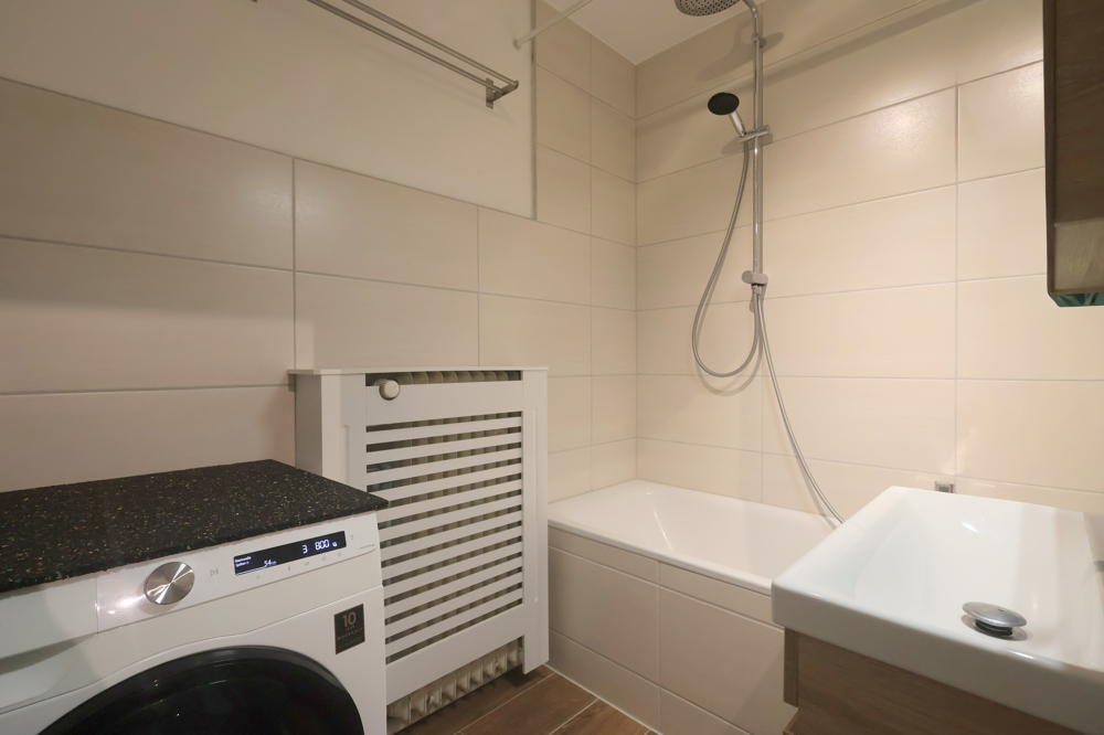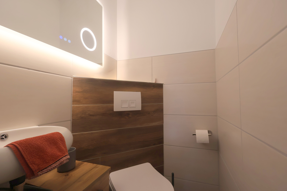 Das moderne und ansprechende Wannenbad sowie das familien- und WG-freundlich separat gelegene WC mit schönem modernem Ambiente runden das Raumangebot innen ab.