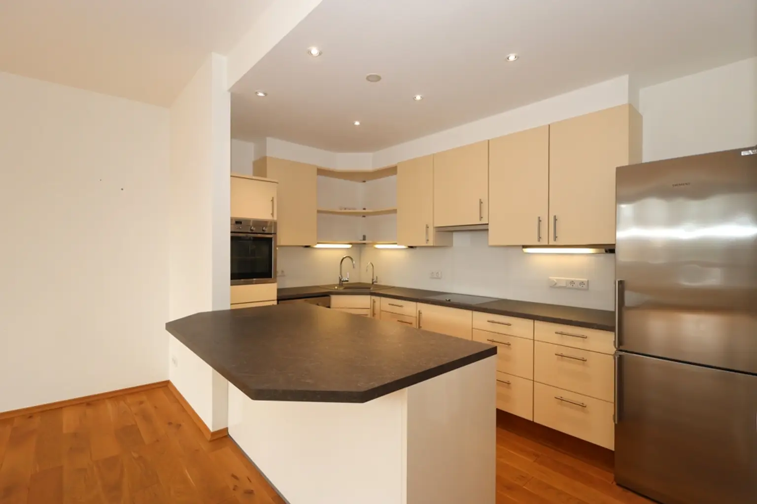 Das Herzstück der Wohnung bildet der weitläufige Wohn- und Essbereich, der durch seine offene Gestaltung und die integrierten Beleuchtungselemente beeindruckt. Die maßgeschneiderte Küche, die im Mietpreis enthalten ist, fügt sich harmonisch in das Gesamtbild ein und bietet optimale Bedingungen für kulinarische Genüsse.