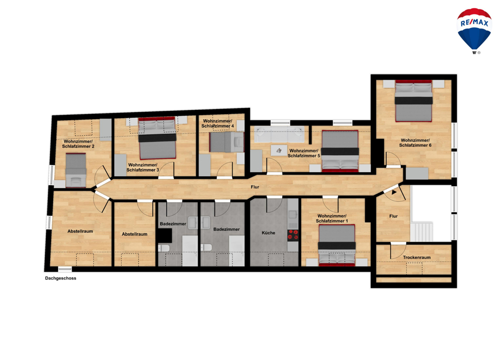 Die große Einheit im 1. Obergeschoss ist derzeit leerstehend und wird neu vermietet.