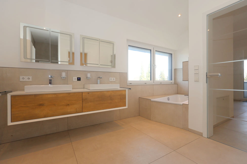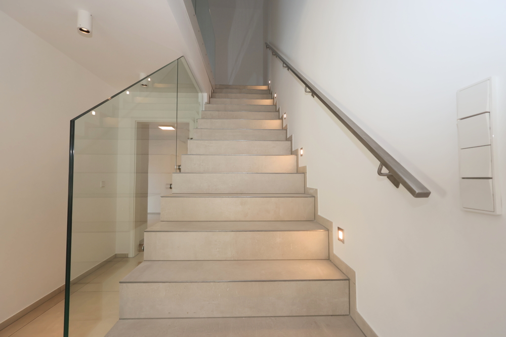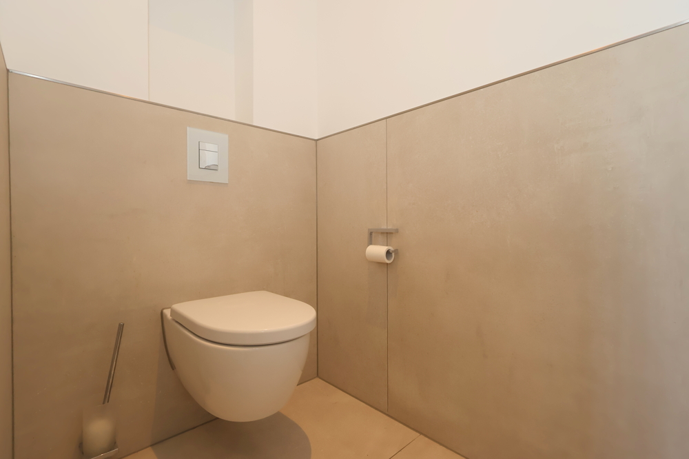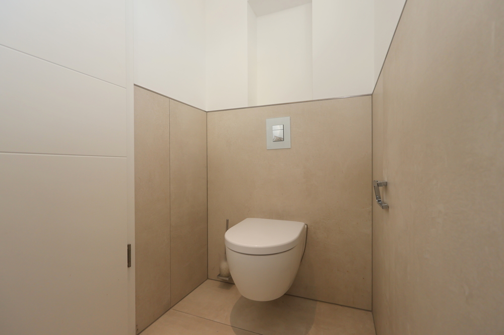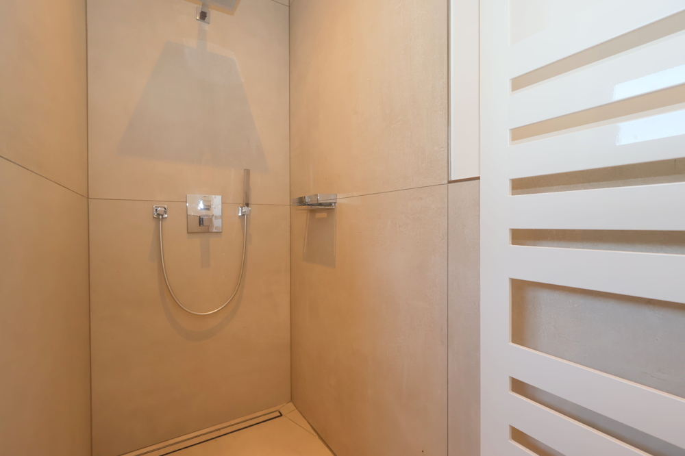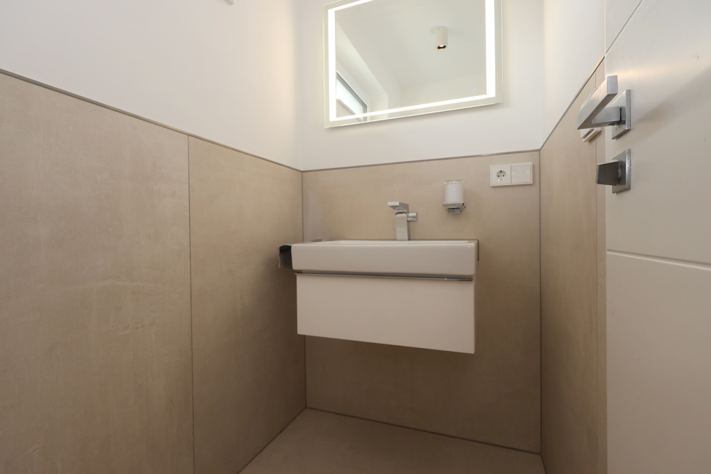 Das Gäste-WC sowie das Hauptbadezimmer mit einer großzügigen Dusche sind modern und stilvoll gestaltet. Die hochwertige Ausstattung zieht sich durch die gesamte Wohnung und sorgt für ein gehobenes Wohngefühl.