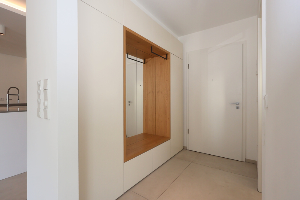 Beim Betreten der Wohnung empfängt Sie ein einladender Eingangsbereich, der nahtlos in den offenen Wohn- und Essbereich übergeht. Große Fensterfronten sorgen für viel Tageslicht und schaffen eine angenehme Wohnatmosphäre. Die moderne Küche ist perfekt in den Wohnbereich integriert und bietet ausreichend Platz für kulinarische Entfaltung.
