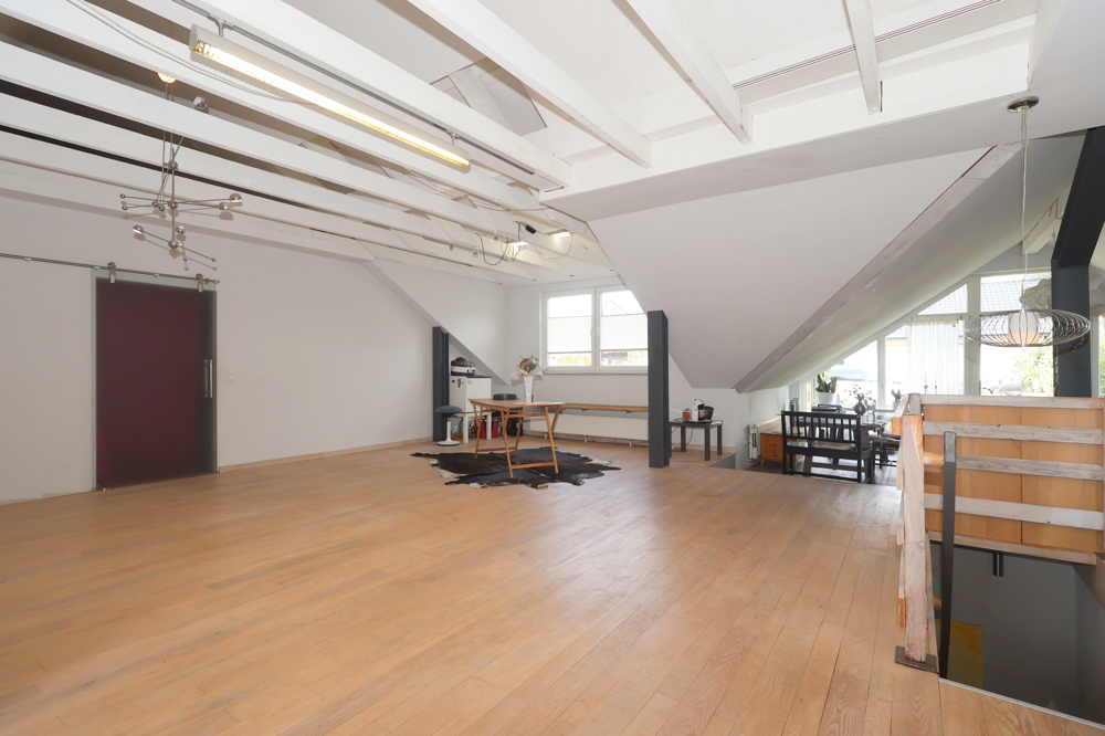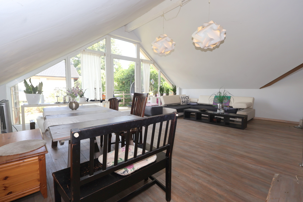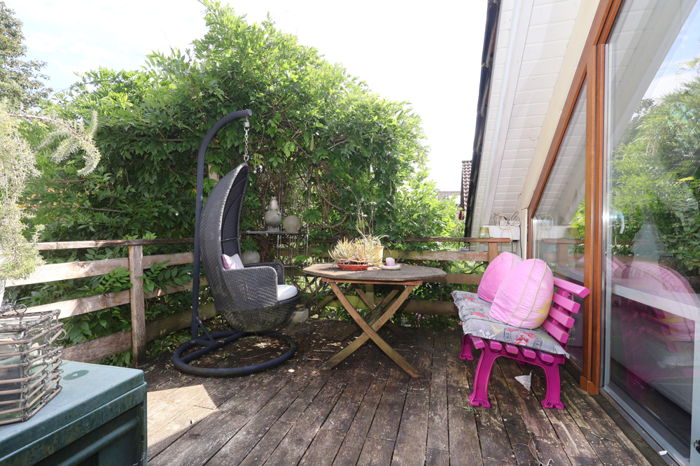 Mit Balkon und Ausblick in den von Bäumen und Sträuchern umrahmten Garten oder in eine idyllische Winterlandschaft bietet sie eine besondere Atmosphäre und vielfältige Nutzungsmöglichkeiten.