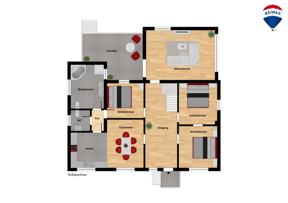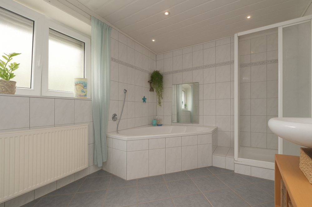 Im Erdgeschoss empfängt Sie eine großzügige Diele, die in die verschiedenen Bereiche führt. Das Herzstück bildet die offene Wohnküche, die als Treffpunkt für Familie und Freunde zum Kochen, Genießen und Verweilen einlädt. Ein Elternschlafzimmer sowie zwei Kinderzimmer bieten ausreichend Platz für die ganze Familie. Ergänzt wird das Raumangebot durch ein großes Badezimmer mit Badewanne, Dusche und WC sowie ein zusätzliches Gäste-WC. Das weitläufige Wohnzimmer mit Kamin sorgt für gemütliche Stunden und öffnet sich zur teilüberdachten Terrasse