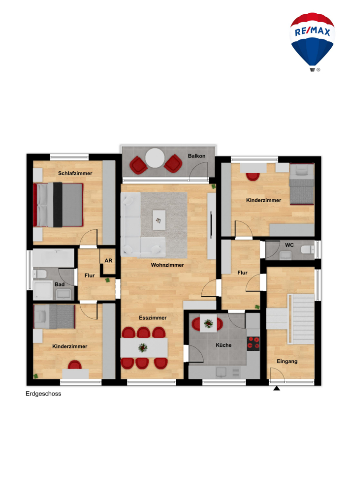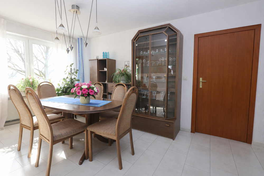 Beim Eintreten empfängt Sie eine zentrale Diele, von der aus die Räume gut erreichbar sind. Der Wohnbereich ist angenehm geschnitten und wirkt durch die großen Fensterflächen hell und einladend. Direkt anschließend liegt der Essbereich, der sich ideal als verbindendes Element zwischen Wohnen und Alltag nutzen lässt.