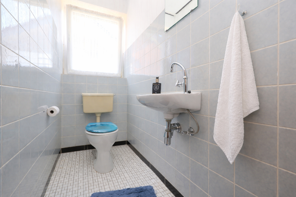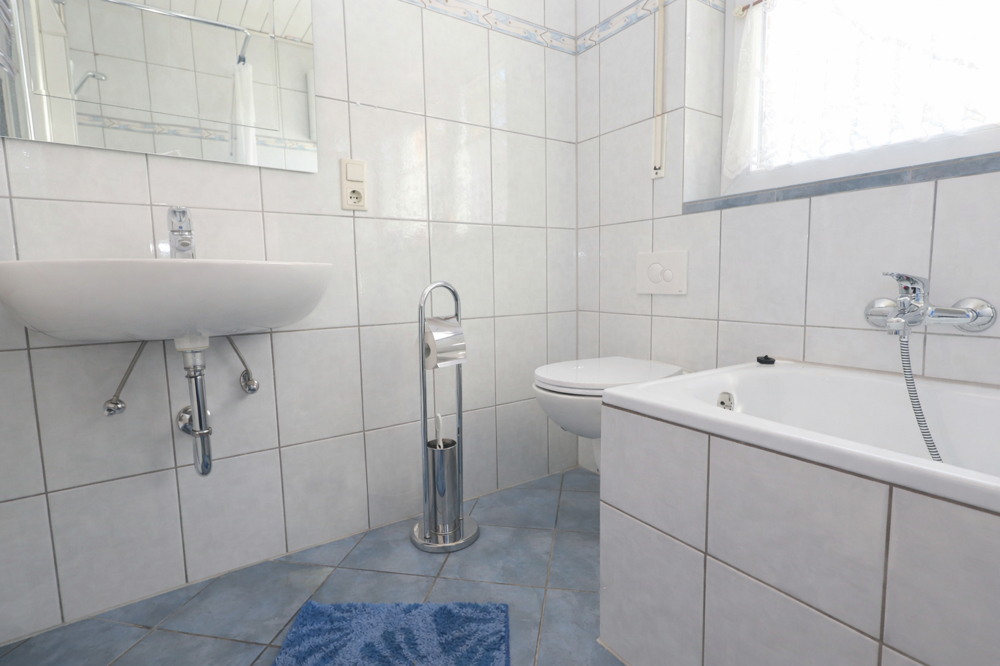 Das Badezimmer ist mit Badewanne, Waschbecken und WC ausgestattet und verfügt über ein Fenster für Tageslicht und Lüftung. Ergänzend steht ein separates Gäste WC zur Verfügung.