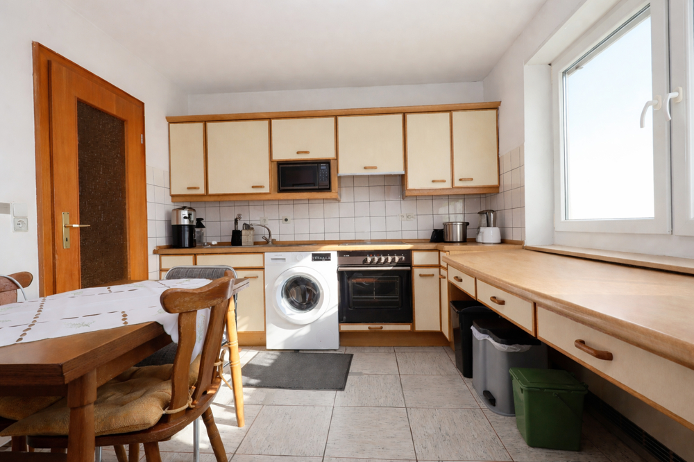 Die Küche ist als separater Raum ausgeführt und bietet neben Arbeitsfläche auch Platz für einen kleinen Esstisch. Die vorhandene Einbauzeile mit Geräten ist funktional angeordnet.