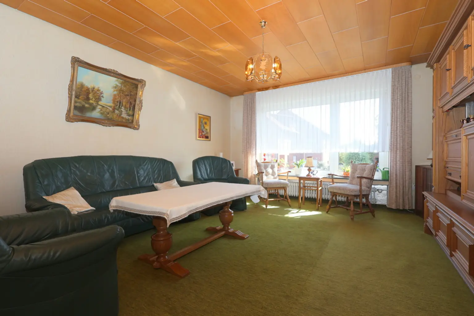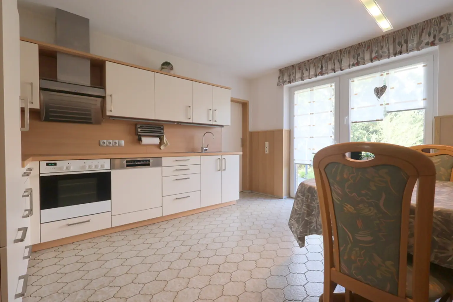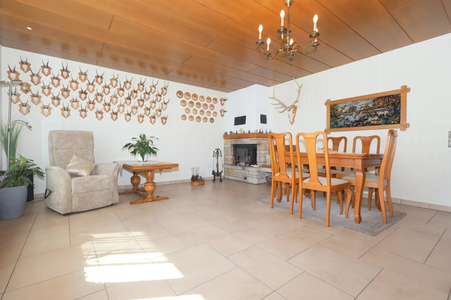 Das Herzstück des Hauses ist das gemütliche Wohnzimmer mit einem einladenden Kamin, der für behagliche Abende sorgt. Die Küche ist modern und funktional gestaltet, ideal für gemeinsame Kochabende. Zwei große Garagen bieten ausreichend Platz für Ihre Fahrzeuge und mehr.