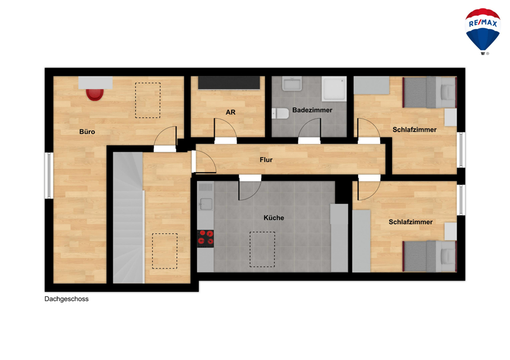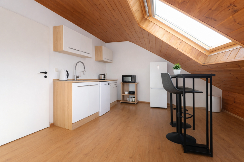 Das Dachgeschoss bietet weitere Räumlichkeiten. Hier befinden sich zwei zusätzliche Schlafzimmer, eine separate Küche sowie ein Badezimmer. Diese Einheit ist derzeit vermietet.
