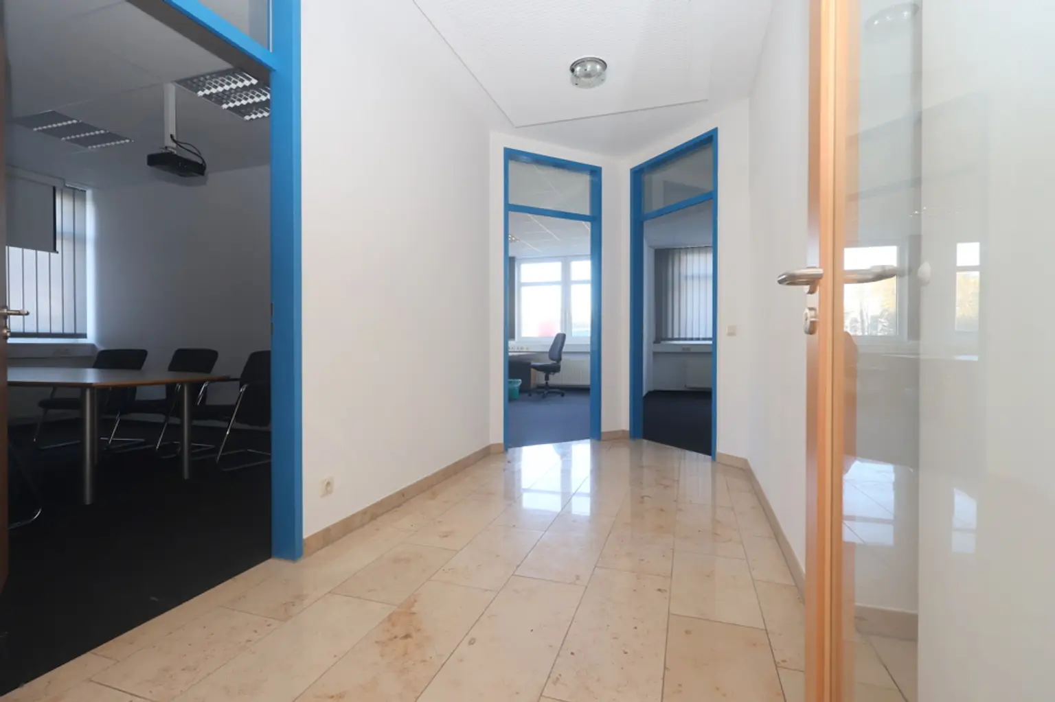 Der Eingangsbereich führt in einen offenen Flur im Erdgeschoss, von dem aus alle Räume bequem erreichbar sind. Die Büros sind mit strapazierfähigen Teppichböden ausgestattet und verfügen über eine zeitgemäße Beleuchtung. Die Räume sind flexibel nutzbar und können individuell gestaltet werden, um den spezifischen Anforderungen Ihres Unternehmens gerecht zu werden.