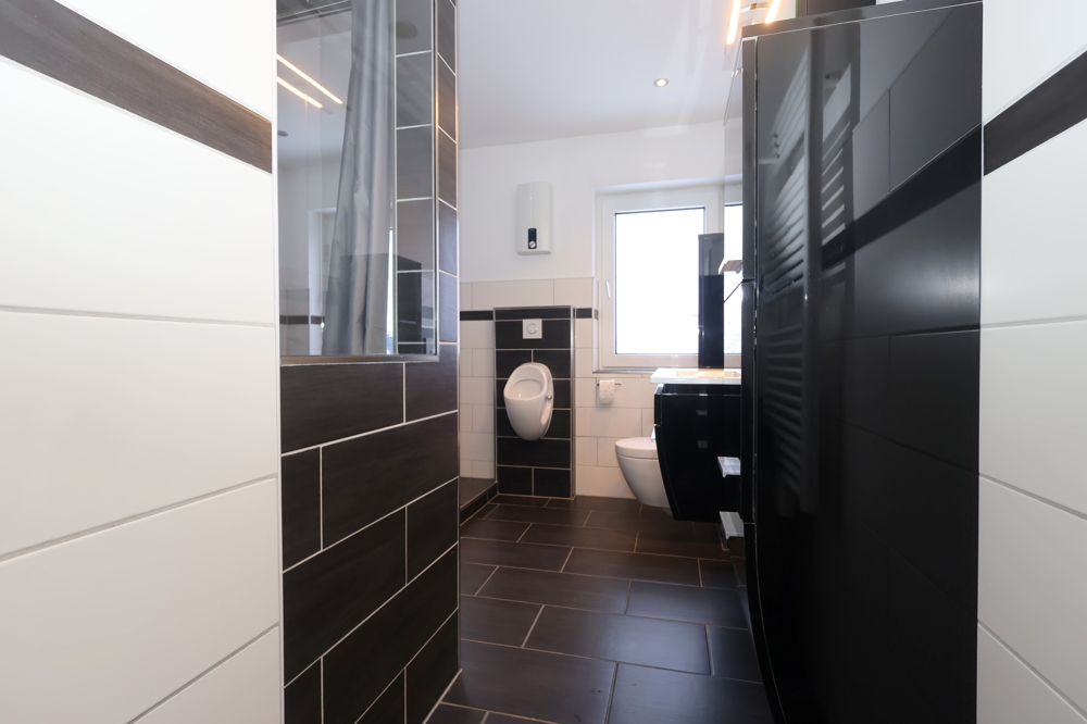 Das Badezimmer ist modern gefliest und mit Badewanne sowie separater Dusche ausgestattet. Ein Fenster sorgt für Tageslicht und angenehme Belüftung. Ergänzend steht ein Abstellraum zur Verfügung, praktisch für Vorräte, Koffer oder Putzutensilien.