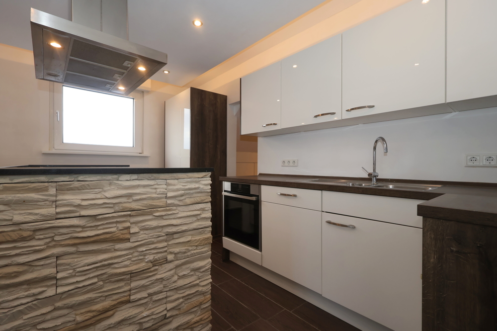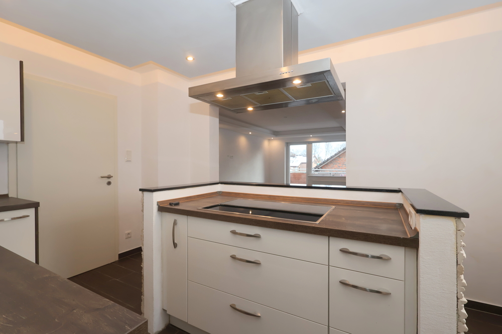 Angrenzend liegt die Küche, die zum Wohnbereich hin offen gestaltet ist. Die vorhandene Einbauküche mit viel Stauraum und Arbeitsfläche unterstützt einen unkomplizierten Alltag, ob schnelles Frühstück oder Kochen mit Freunden.