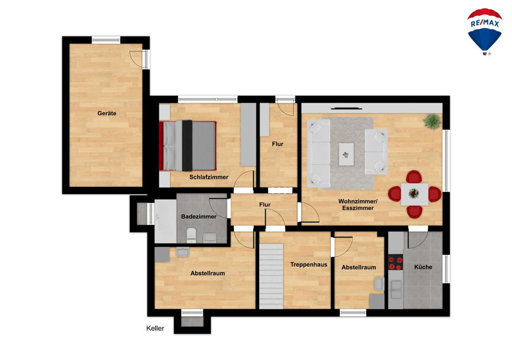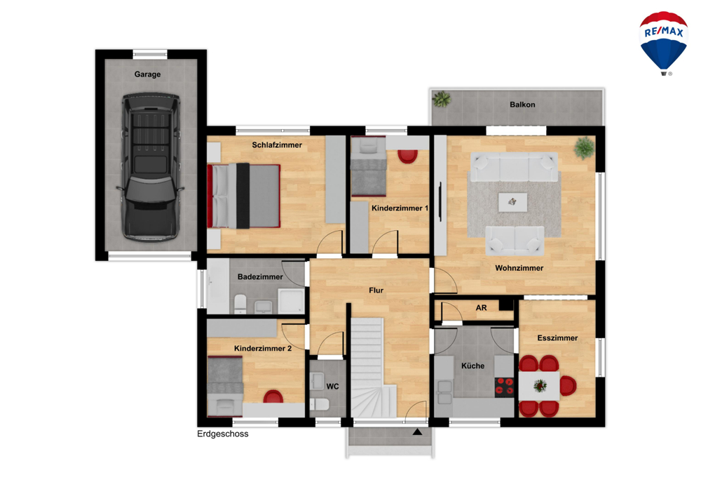 Der Zugang erfolgt über den zentralen Eingangsbereich mit Treppenhaus. Von hier aus erschließen sich die Räume im Erdgeschoss. Das großzügig geschnittene Wohnzimmer überzeugt durch viel Tageslicht und bietet einen direkten Zugang zum Balkon – perfekt als Erweiterung des Wohnbereichs. Angrenzend befindet sich das Esszimmer, das sich flexibel als klassischer Familien-Essplatz oder als zusätzlicher Wohnbereich nutzen lässt. Die Küche ist separat angeordnet und bietet eine praktische Aufteilung. Ein Abstellraum in Küchennähe sorgt für wertvolle Staufläche. Ergänzt wird das Erdgeschoss durch ein WC sowie ein Badezimmer. Zudem stehen ein Schlafzimmer und zwei Kinderzimmer zur Verfügung.