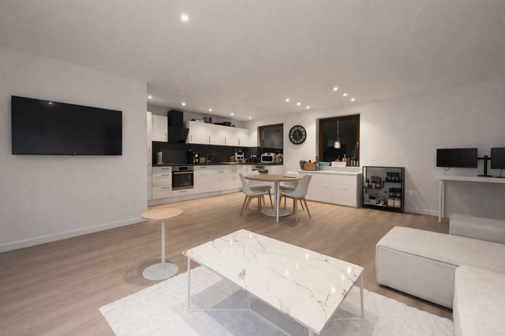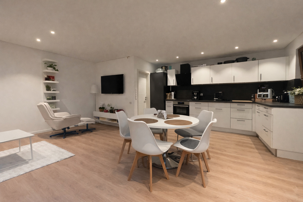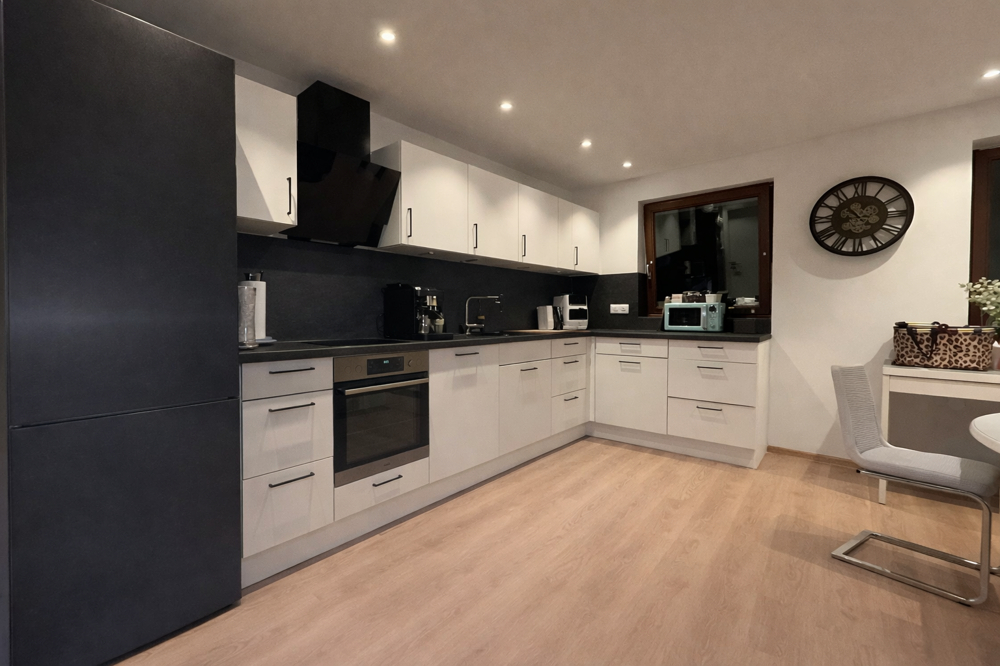 Vom Eingangsbereich gelangen Sie in den Flur mit Platz für eine Garderobe. Von hier aus sind die Räume gut erreichbar. Das Wohn- und Esszimmer ist großzügig geschnitten und wirkt durch die zahlreichen Fensterflächen angenehm hell. Direkt angebunden ist die Küche, die als moderne Einbauküche in L-Form ausgeführt ist und viel Arbeits- und Stauraum bietet.