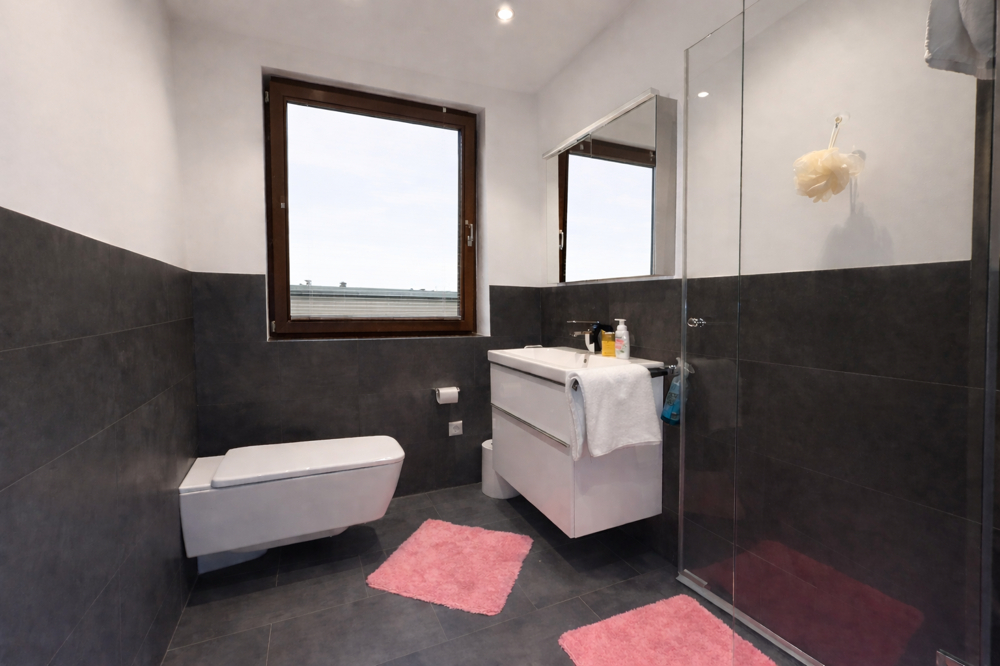Das Schlafzimmer liegt ruhig und verfügt über einen praktischen Ankleidebereich. Das Badezimmer ist zeitgemäß gestaltet und mit einer bodengleichen Dusche, wandhängendem WC sowie Waschtisch ausgestattet. Eine Terrasse ergänzt den Wohnbereich und bietet zusätzlichen Platz im Freien.