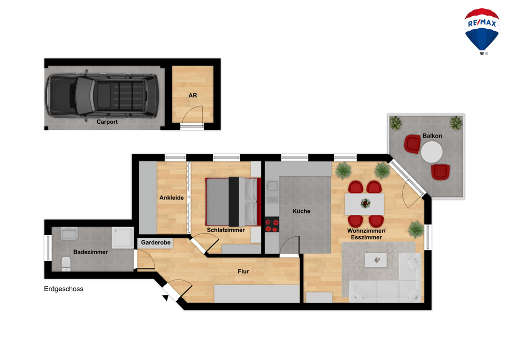 Abgerundet wird das Angebot durch einen separaten Abstellraum sowie einen Carport-Stellplatz gemäß Grundriss.