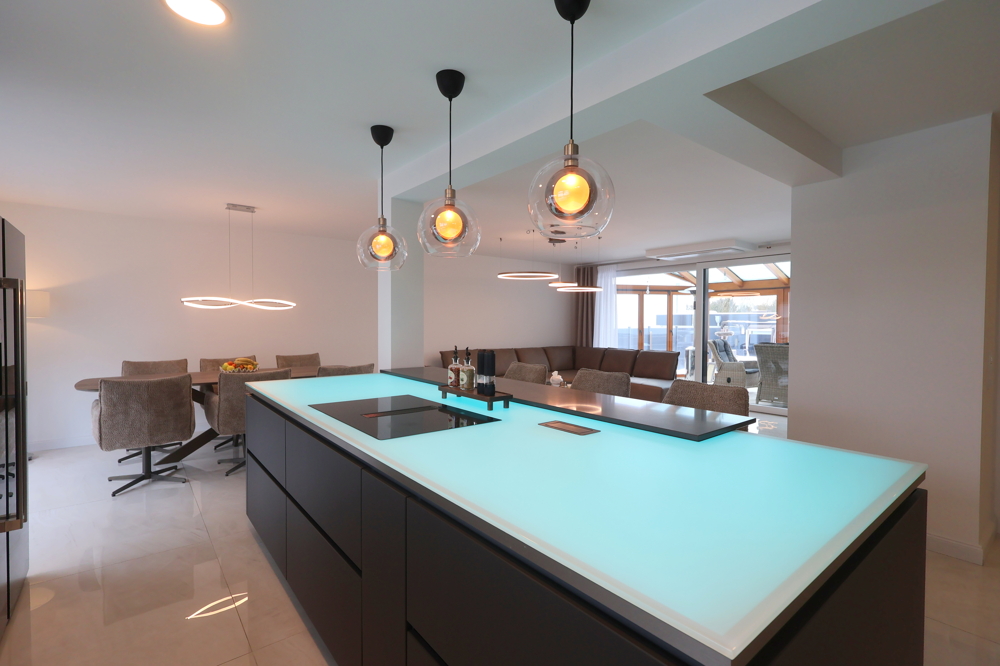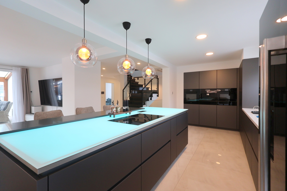 Die exklusive Nobilia-Premiumküche wird zum Herzstück des Hauses: Ausgestattet mit einem innovativen Cooker für Sprudel- und Heißwasser, integriertem Kaffeevollautomaten, eleganten Lautsprechern, Wärmeschublade sowie elektrisch ausfahrbaren Schubladen verbindet sie Design, Technik und Genuss auf höchstem Niveau – hier wird Kochen zum Erlebnis.