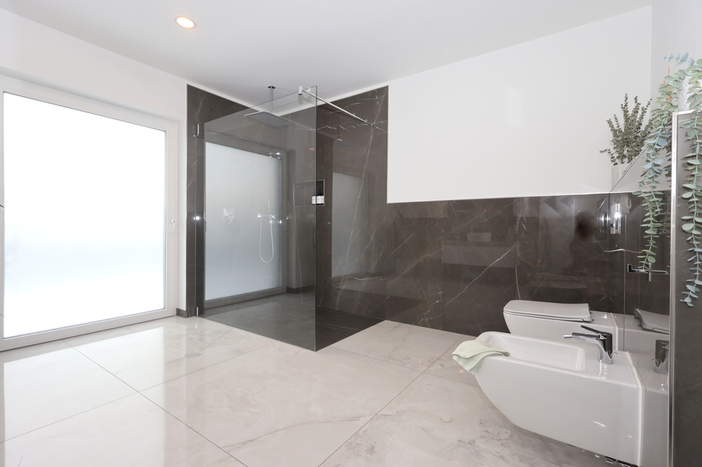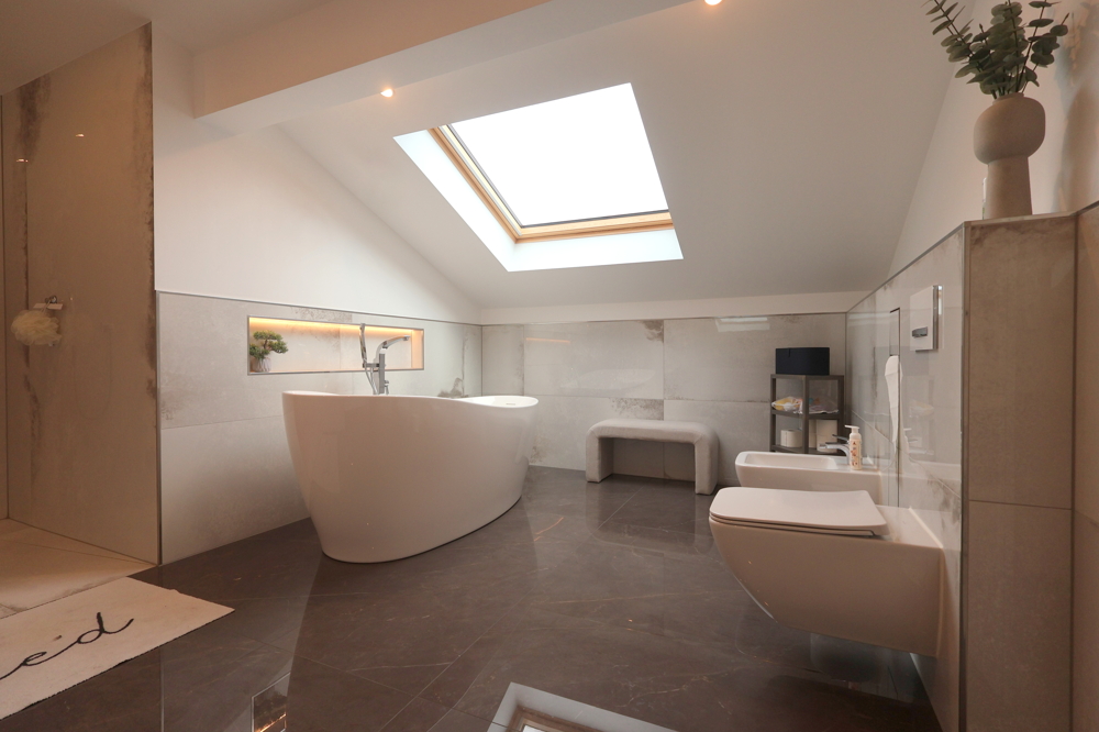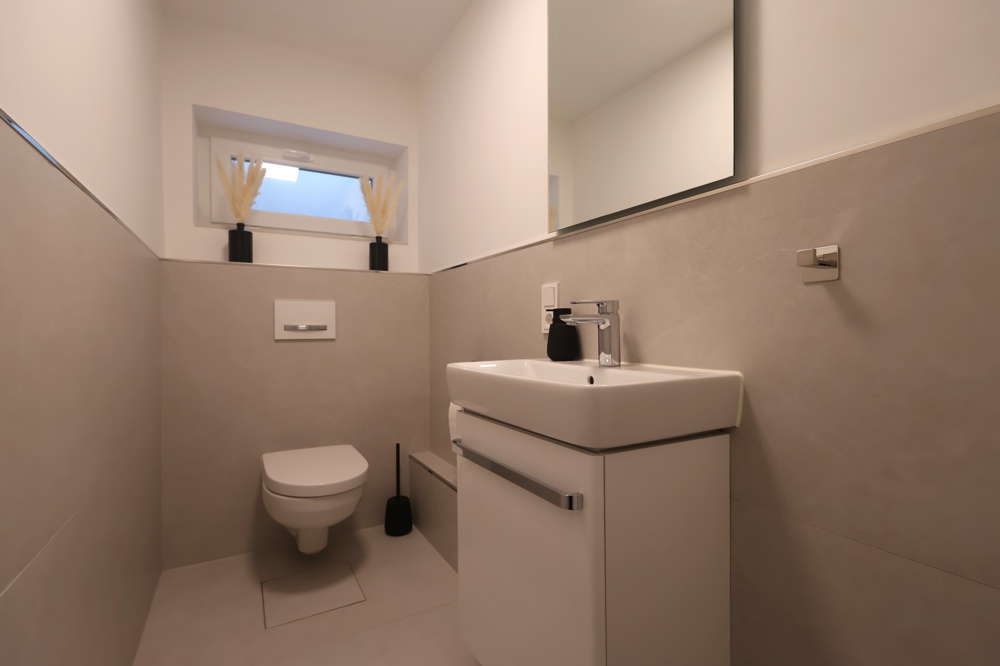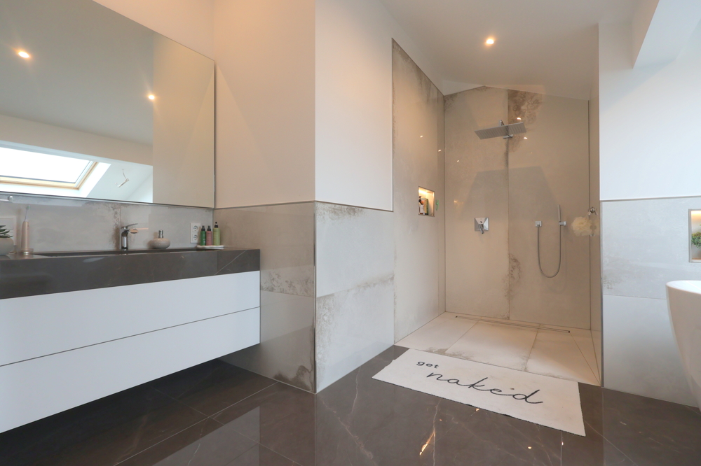 Ein luxuriöses Badezimmer mit bodentiefer XXL-Dusche, edlem Designer-Waschtisch, WC und Bidet unterstreicht den hohen Anspruch dieser Etage. Ergänzt wird das Raumangebot durch ein lichtdurchflutetes Spielzimmer, ein stilvolles Gästezimmer, ein großzügiges Arbeitszimmer sowie einen praktischen Abstellraum.