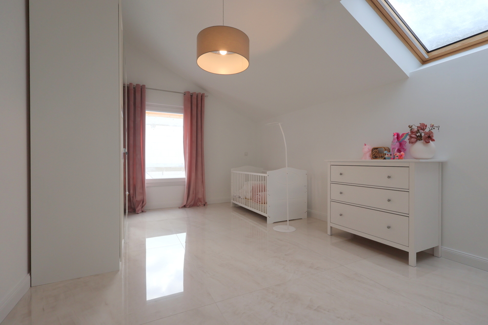 Im Obergeschoss entfaltet sich die private Welt dieses Anwesens. Hohe Decken verleihen den Räumen ein beeindruckendes Raumgefühl. Drei behagliche Kinderzimmer sowie ein modernes Badezimmer bieten Platz für Familie und Geborgenheit.