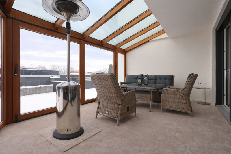 Der angrenzende Wintergarten bildet eine harmonische Verbindung zwischen Innen- und Außenbereich und eröffnet einen traumhaften Blick in den liebevoll gestalteten Garten – ein Ort der Ruhe und Entspannung zu jeder Jahreszeit.
