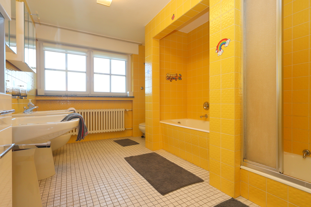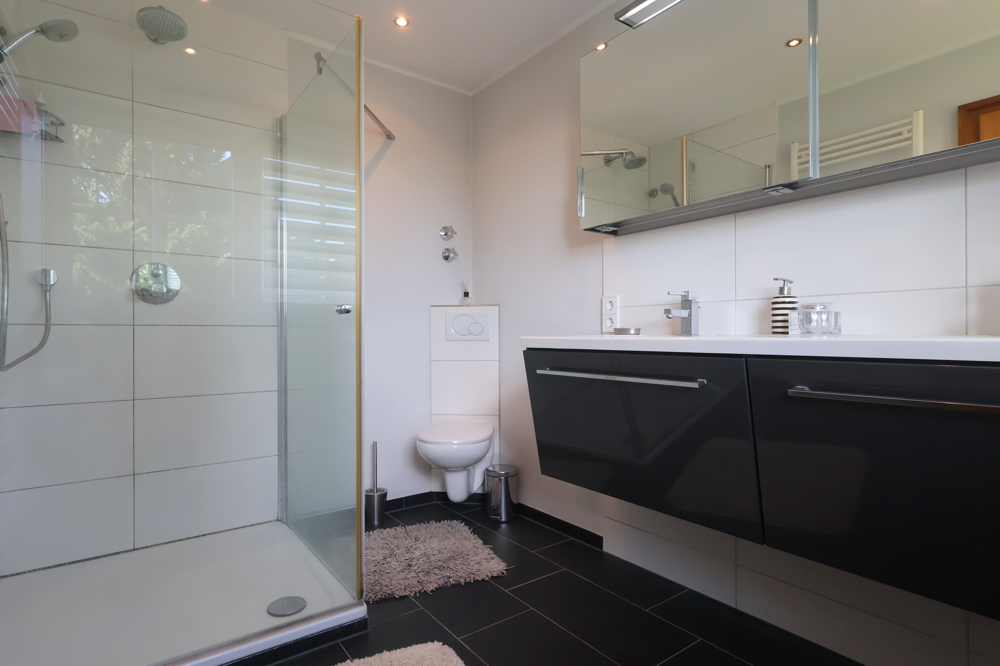Die Badezimmer bieten moderne Annehmlichkeiten, wie Badewannen und Regenduschen für höchsten Komfort.
