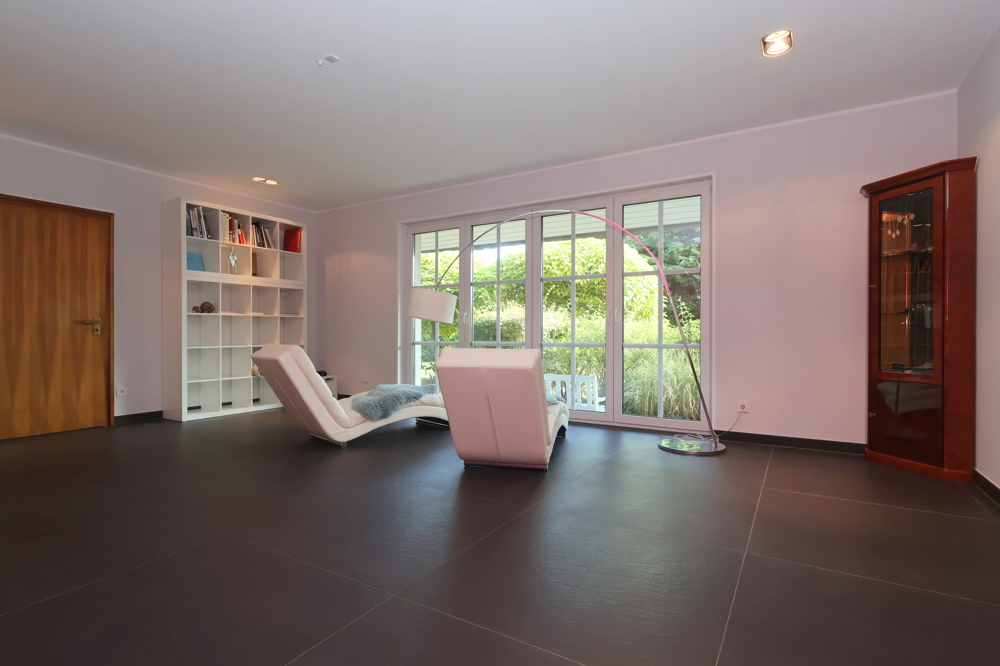 Das Esszimmer bietet Platz für große Tafelgesellschaften und ist durch eine Verbindung zum Wohnbereich auch für Unterhaltungen und gemeinsame Speisen perfekt geeignet.