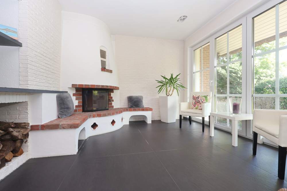 Ein großzügiger, offener Wohnbereich mit einem Kachelofen sorgt für Behaglichkeit und eignet sich ideal für gesellige Abende. Entspannen Sie hier und lassen Sie Ihre Seele baumeln.