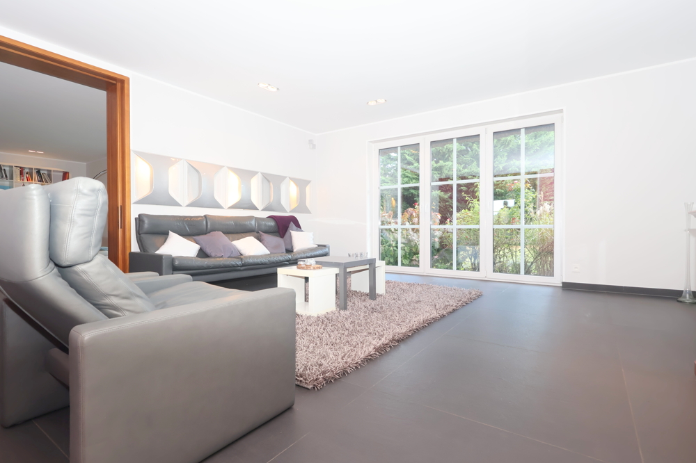 Im Innenraum wurde auf edle Materialien wie Naturstein, Holz und Glas gesetzt, was der Villa eine warme, einladende Atmosphäre verleiht.