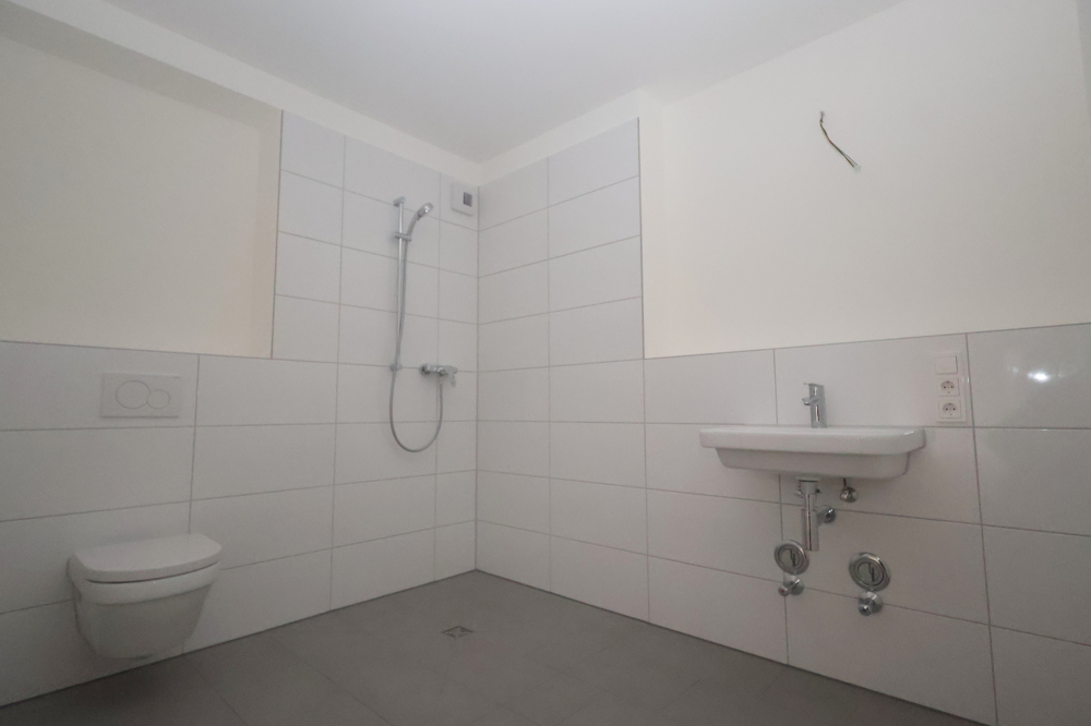 Das Schlafzimmer ist sehr geräumig und bietet vielfältige Gestaltungsmöglichkeiten. Die Küche kann vom Mieter frei geplant und eingebaut werden, sodass sie sich perfekt an die eigenen Wünsche anpassen lässt. Das Hauptbad ist modern ausgestattet und verfügt über eine bodentiefe Dusche; zusätzlich steht ein separates Gäste-WC zur Verfügung. Ein praktischer Abstellraum mit Waschmaschinenanschluss ist hier nur selbstverständlich.