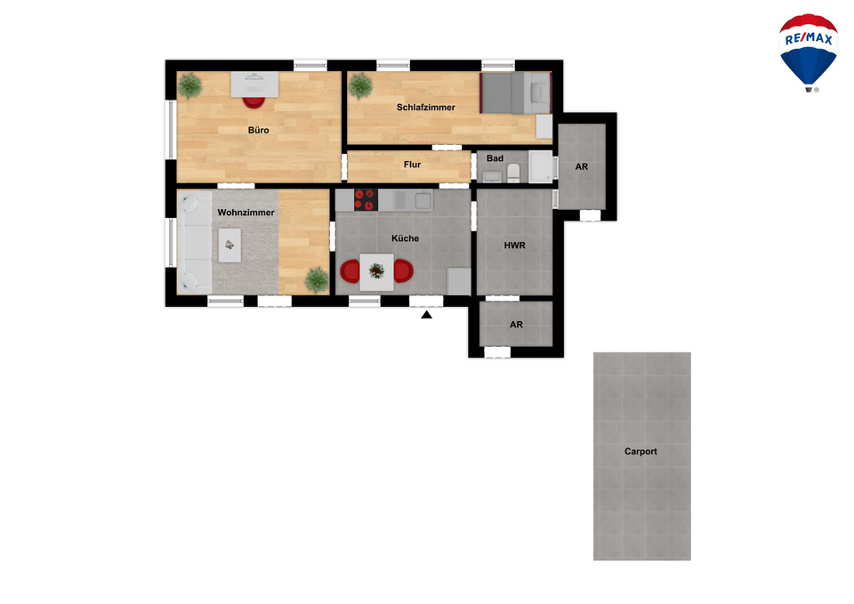 Dieses Wohnmobilheim bietet ein gemütliches Wohnzimmer, ein Arbeitszimmer, eine Küche und ein Schlafzimmer sowie ein kleines aber feines Badezimmer.
